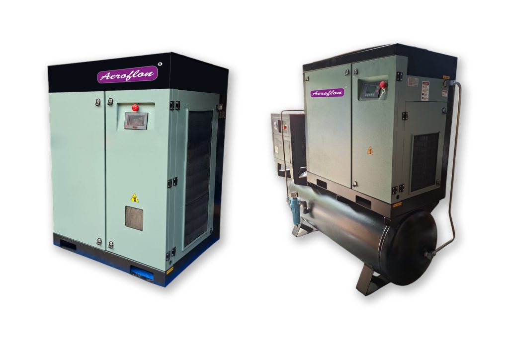 Aeroflon’s screw compressors integrate IE4 IPM motors with VFDs for unmatched energy efficiency and lower operational costs. Built for continuous duty cycles, they are ideal for medium to large industries.